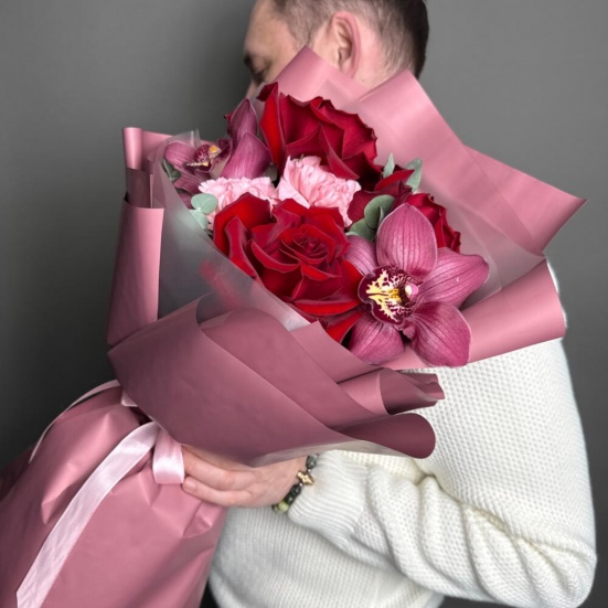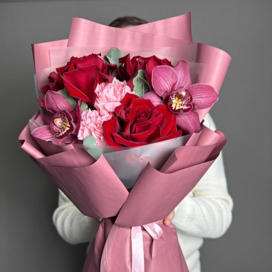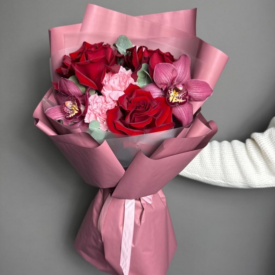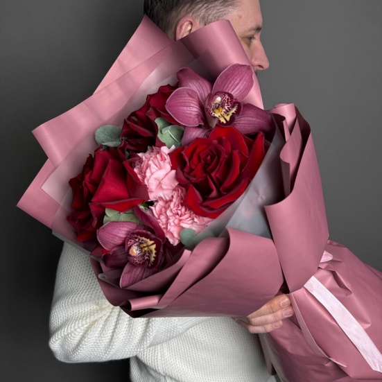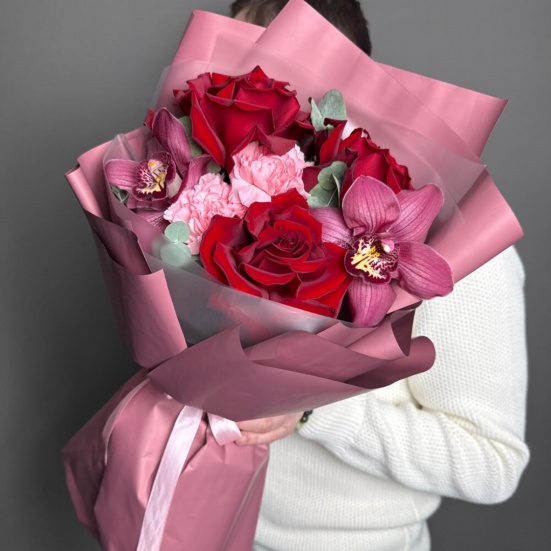 Букет из 3 красных роз, орхидей и диантуса в Муроме